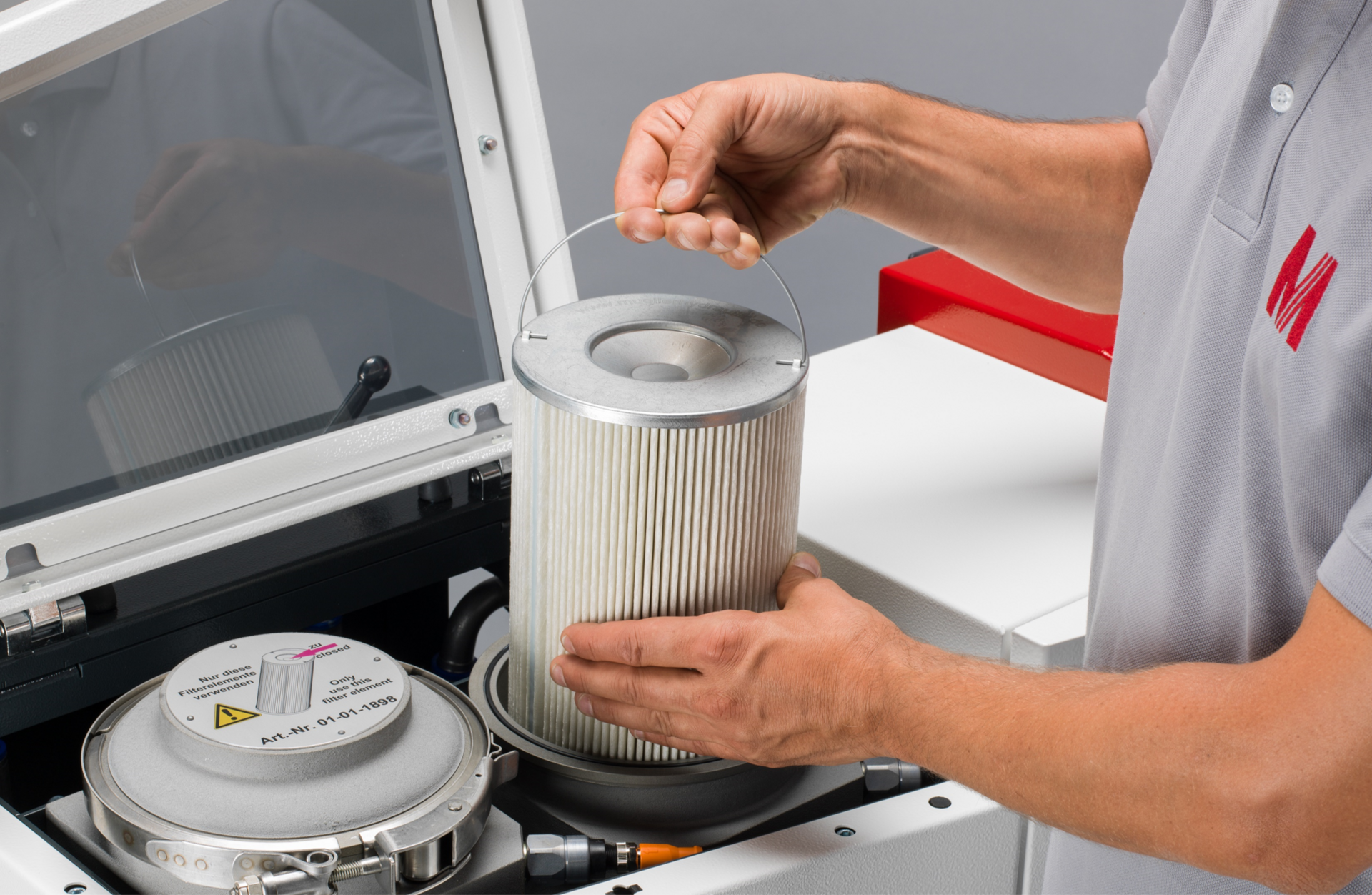 So how do all these benefits come about? It’s quite simple. Imagine the compact belt filter as a filter coffee machine. Filtration is based purely on gravity. It takes time for the medium to pass through the process. The more contaminated medium there is, or the less that flows away, the more the filter fills up with medium, and the faster the float gives the signal to continue the belt’s cycle. This in turn leads to a relatively faster consumption of the nonwoven fabric, and with that to more frequent changes. In the case of Müller’s cascading filter system, the medium is firstly pre-filtered, and secondly is literally pushed through the elements. This results in a higher availability of the pure medium thanks to the large elements. And only from a certain differential pressure, i.e., when the filter cake is too impermeable, is the signal to change given.