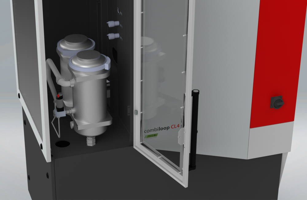 The compactness, with simultaneous performance and high efficiency, results among other things from the intelligent, space-saving filtration concept as well as the pressure-controlled piston pump technology. The models combiloop CL3 G eco+ 50/45 and 70/40 measuring 1,300 x 600 x 1,100 mm (L x W x H) in particular are unrivalled in this field of application. These systems are mobile, and can also be used on a range of machines. The combiloop CL4 models, on the other hand, are stationary. However, with the clever technology built on the clean tank – and wonderful accessibility thanks to the door – the combiloop CL4 G-400 eco+ of with up to 60 l/min at 70 bar is a real space-saver.